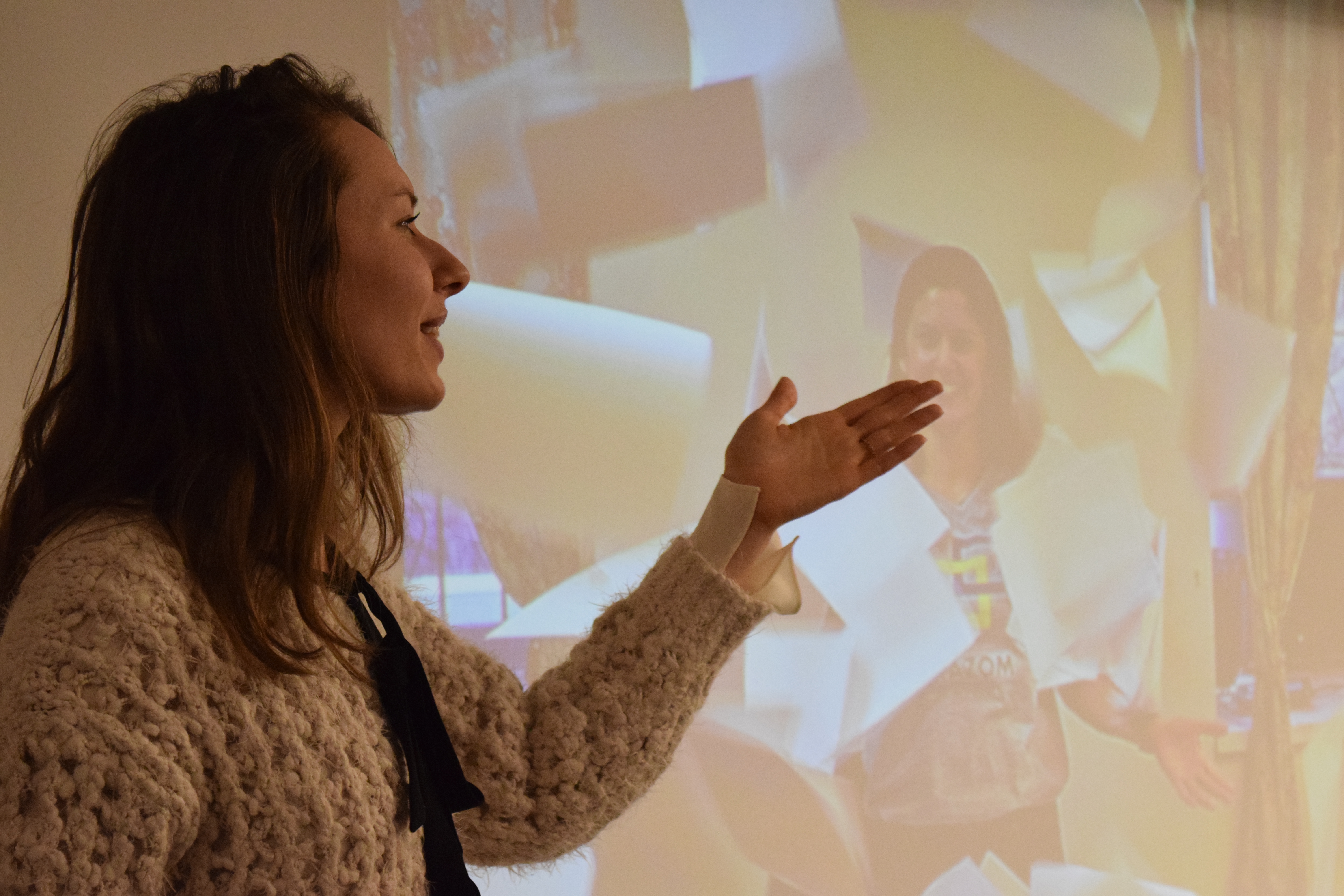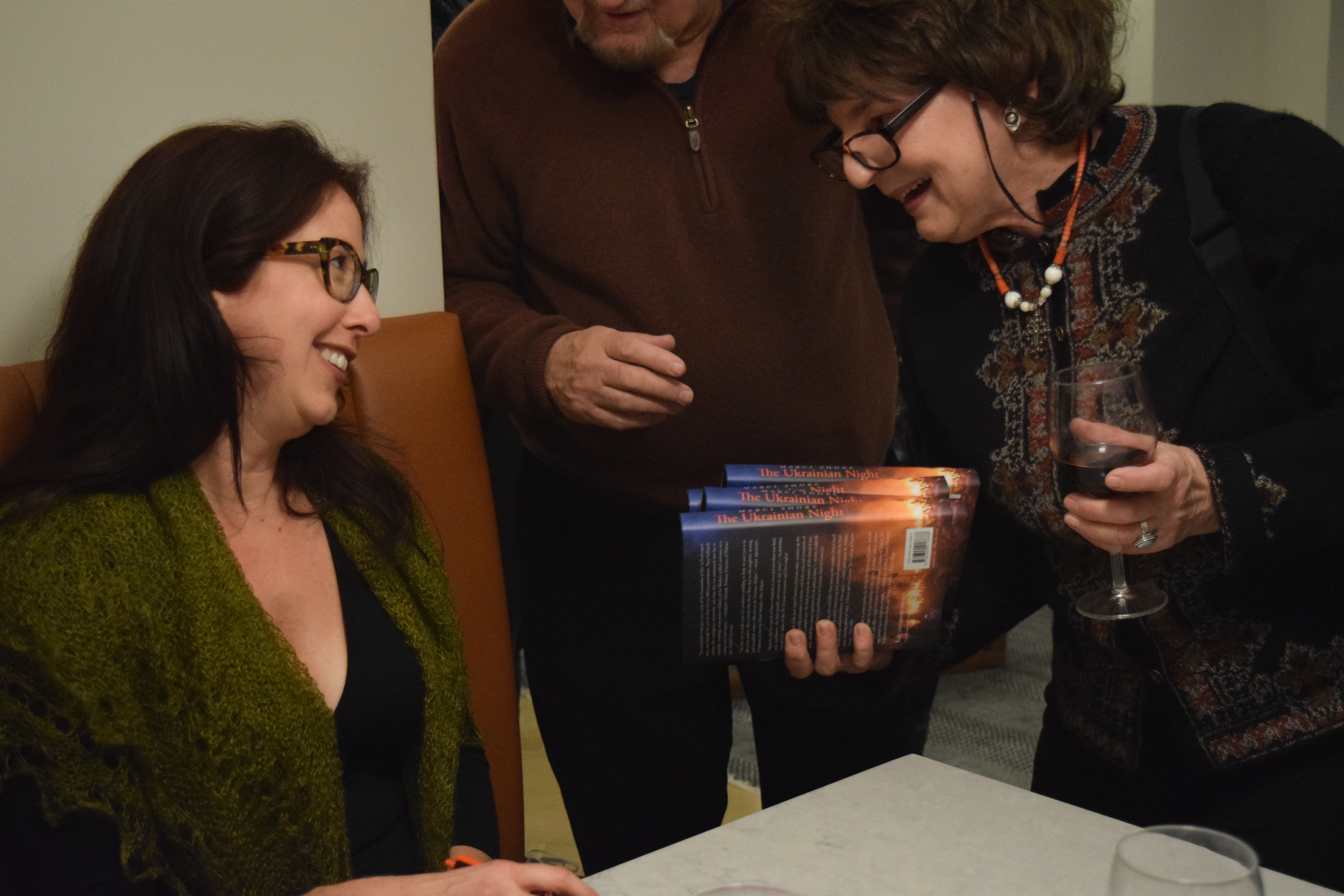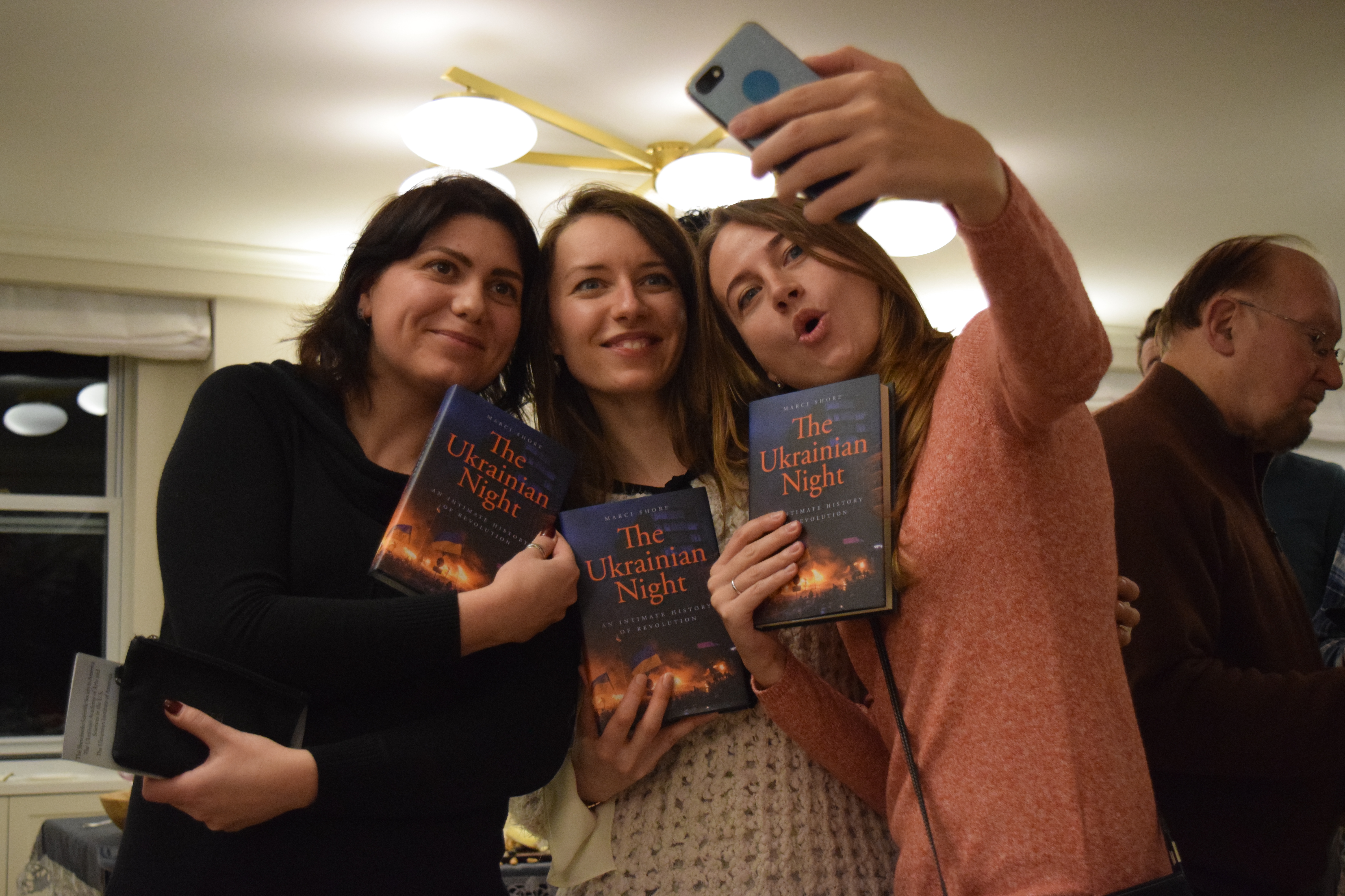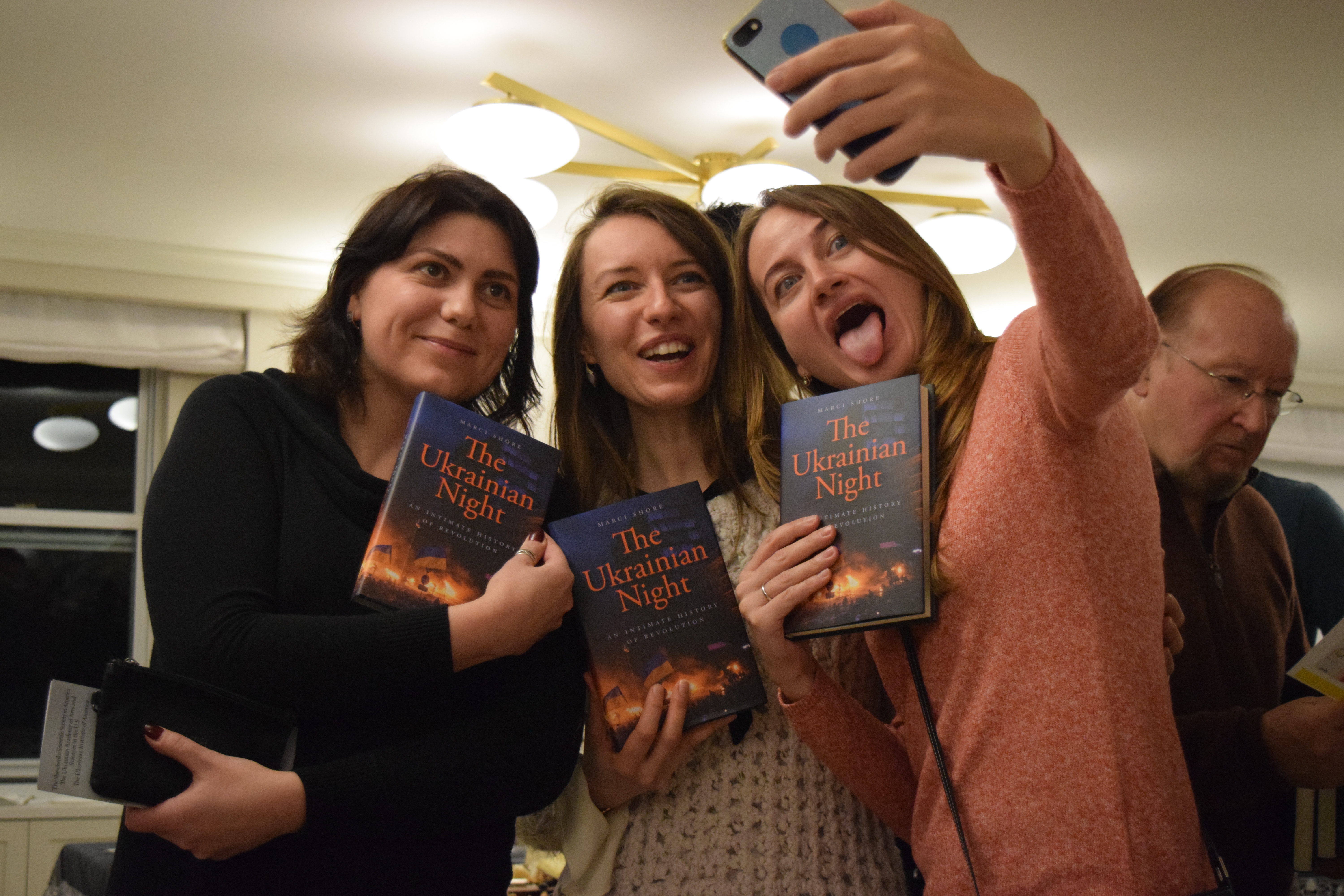 The evening started off with three founders of Razom putting their human face on the revolution and recounting the first days of the organization. See the photos below of Mariya Soroka, Lyuba Shipovich, and Olya Yarychkivska showing some photos from the early days. After the talk Dr. Shore signed copies of her book.