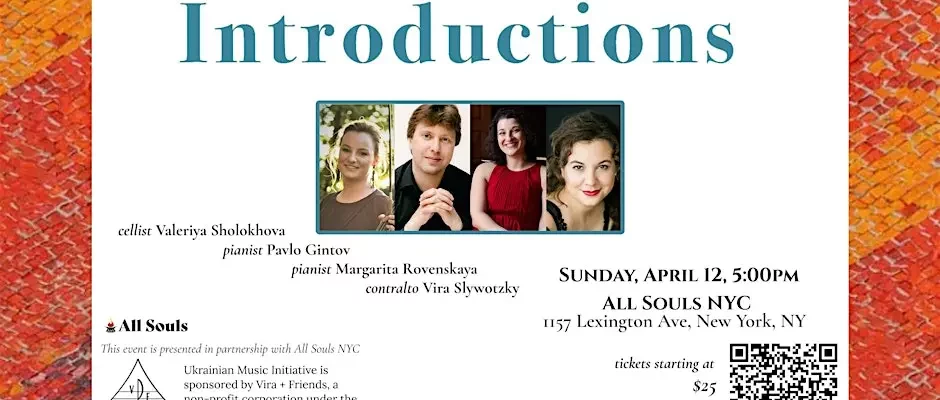 Ukrainian Music Initiative‘s mission is to elevate Ukrainian classical music to its rightful place in the Western canon through performance and education. INTRODUCTIONS features the musicians of the ensemble – contralto Vira Slywotzky, cellist Valeriya Sholokhova and pianists Pavlo Gintov and Margarita Rovenskaya – performing their favorite chamber works from the Ukrainian classical repertoire. This sampling showcases the breadth of two centuries of composition and includes music by living composers. Enjoy sumptuous, dramatic, tender, moving, poignant, reflective, fun and, always and most importantly, beautiful melodies from Theodore Akimenko, Andrii Didorenko, Mykola Lysenko, Valentin Silvestrov, Ihor Sonevytsky, Yakiv Stepovy, Kyrylo Stetsenko, Stefania Turkewich and Olga Zaitseva-Herz.