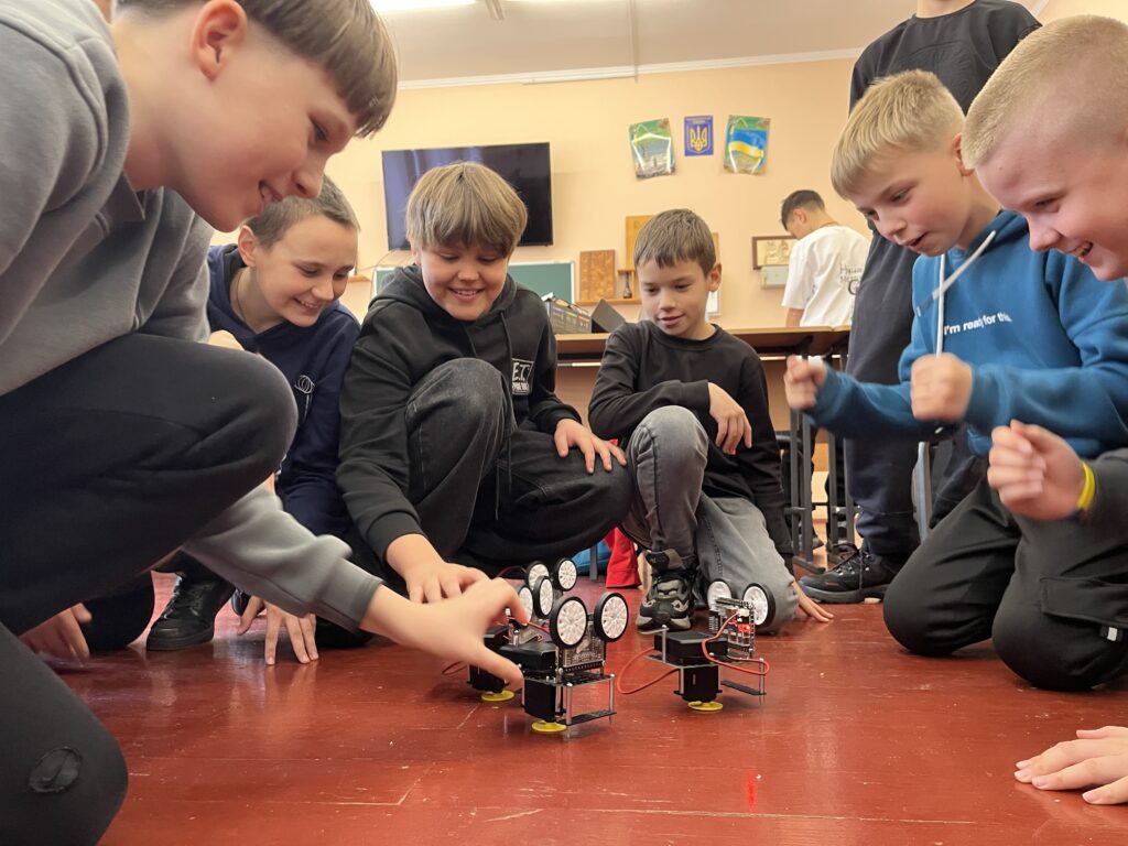 The teacher Zakhar speaks about is the STEM instructor Oleksii Ivanovych. Before Razom funded robotics kits, he had shown great creativity by teaching robotics concepts using cardboard, scrap wood, and improvised materials. He always believed his students deserved real tools that matched their curiosity. Now that the kits are here, he sees their impact immediately: “We’re finally keeping up with the modern world,” he says. “This equipment teaches kids to think critically, work in teams, discuss problems, and solve them.”
