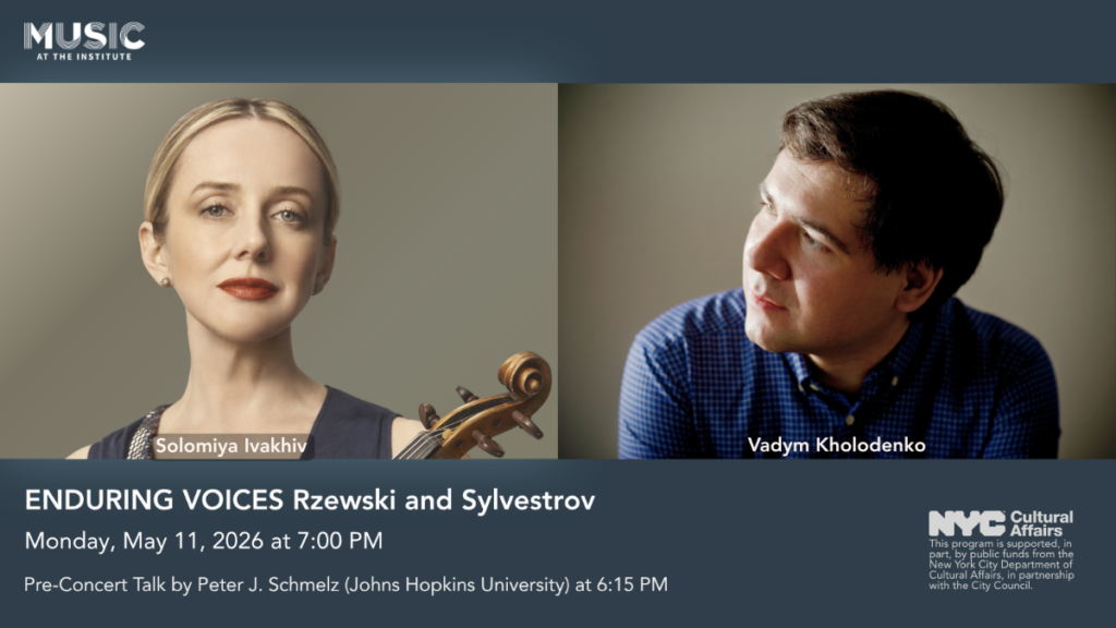 Music at the Institute presents an evening with Van Cliburn Gold Medalist Vadym Kholodenko and violinist Solomiya Ivakhiv, featuring works by Frederic Rzewski and Valentyn Sylvestrov. This powerful program brings together two distinctive musical voices, reflecting on history, memory, and expression through contemporary composition. The concert will be preceded by a talk from musicologist Peter J. Schmelz, offering deeper insight into Soviet-era music and its legacy.