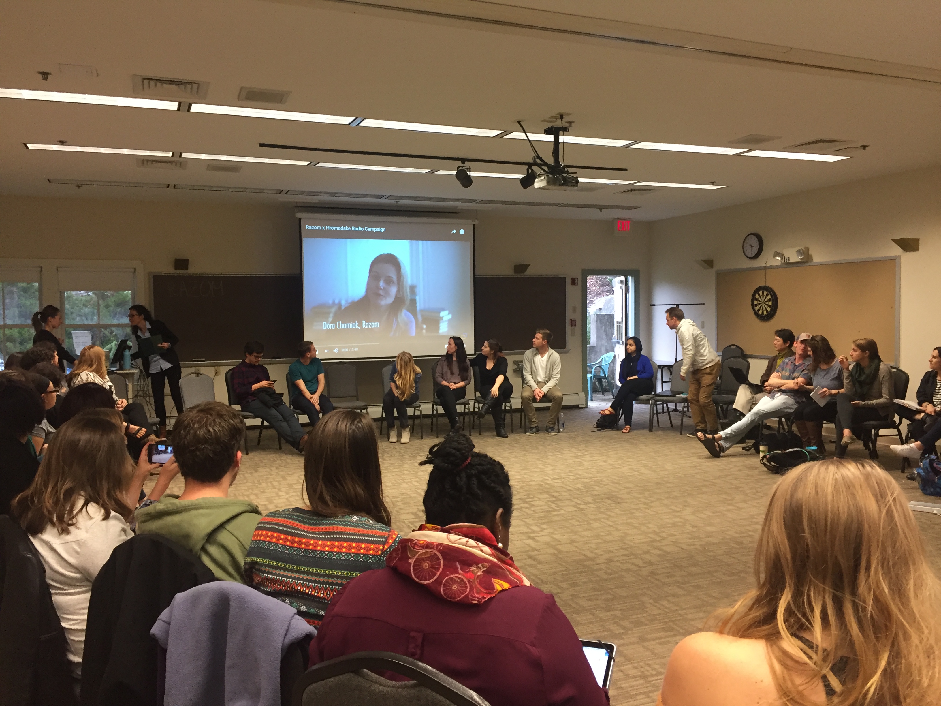 Alla Korzh is co-instructor for the course “Foundations of Intercultural Service, Leadership, and Management”, and has been studying Razom as part of her research on youth activism in times of crisis. She chose to introduce her students to Razom as a successful case of young reformers that get organized and help to drive social change, and invited a group of Razom members to participate in a panel discussion. Eight Razom members from different parts of the US – and Sweden – didn’t hesitate to participate. What better way to spend a fall weekend than to make a road trip to Vermont, spend time together in the beautiful landscape and share their experiences of how they got organized to help build a prosperous Ukraine?
